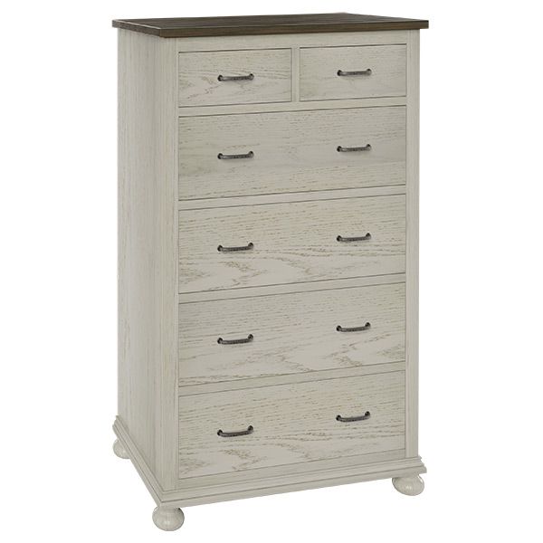 Available in multiple species and finishes. Base shown in Oak with OCS 342 White finish w/Dark Gossimer Glaze, tops shown in Red Hickory with OTS 500 Gunsmoke finish and K-527-SIM hardware.