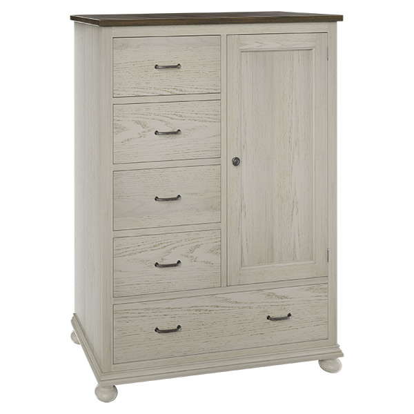 Available in multiple species and finishes. Base shown in Oak with OCS 342 White finish w/Dark Gossimer Glaze, tops shown in Red Hickory with OTS 500 Gunsmoke finish and K-527-SIM hardware.