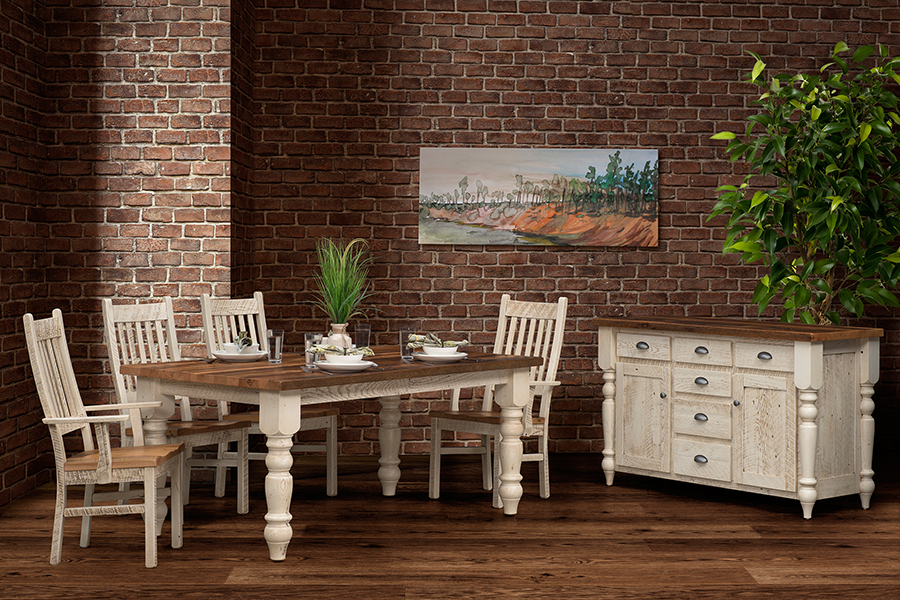 Available in multiple finishes. Shown in Barnwood with Distressed Pearl and Clear top finish.
